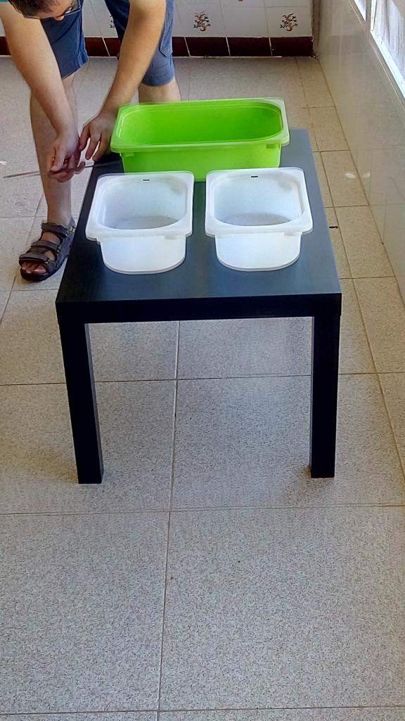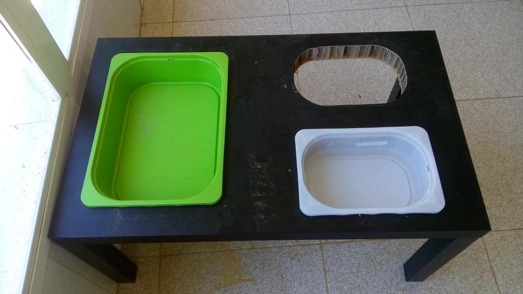Por fín nos hemos decidido, hemos tenido un rato para comprar los materiales y las ganas para hacer la mesa sensorial para los niños, porque la verdad es que no veíamos el momento mientras estábamos trabajando para hacerla, y aquí está.