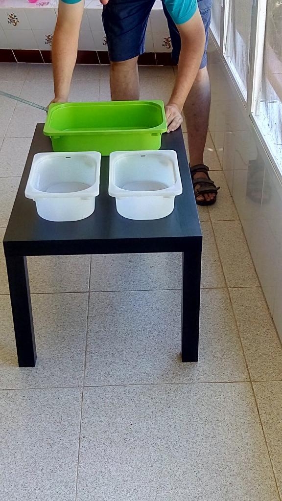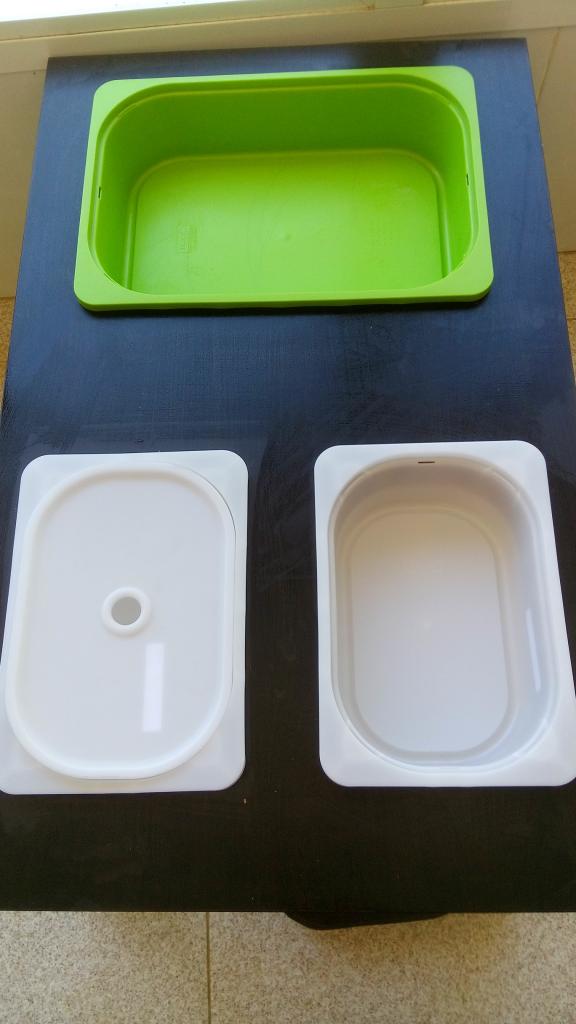Mesa de arena y agua con tapa a modo de soporte (las cubetas tienen menos capacidad que las anteriores pero se pueden sacar de manera individual, así que son más fáciles de limpiar).