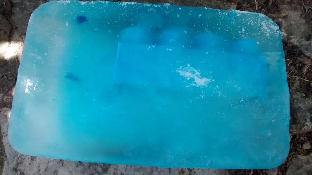 Consiste en poner agua con unas gotas de colorante alimenticio en un tupper grande, sumergimos un juguete de los peques (nosotros sumergimos una pieza de construcciones) y lo dejamos en el congelador hasta que se solidifique del todo.