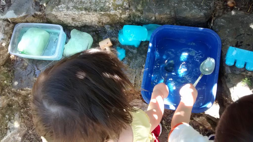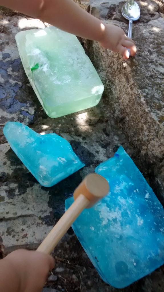 Cuando hizo calor, un día de esos insoportables, sacamos los bloques de hielo del congelador y les dí unas cucharas y una maza de madera pequeña y les dejé que experimentasen con el hielo, primero lo cogían, lo examinaban, y luego lo golpearon hasta comenzar a romper el hielo.
