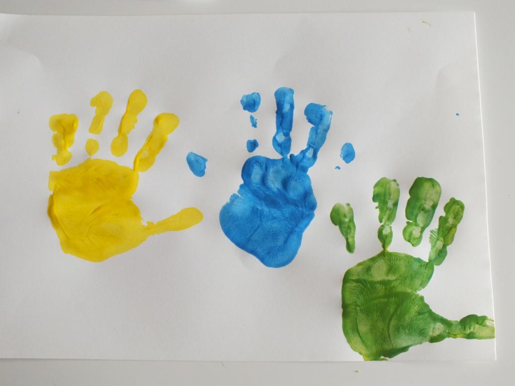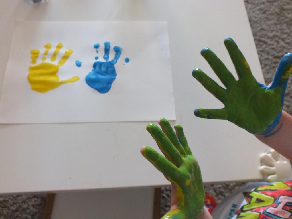 La última actividad que hemos hecho hoy ha sido esta, pintarnos las manos, marcarlas en una cartulina y ver qué colores salen. Después de toda la semana haciendo actividades con colores primarios, los peques ya eran capaces de predecir el color que iba a salir.