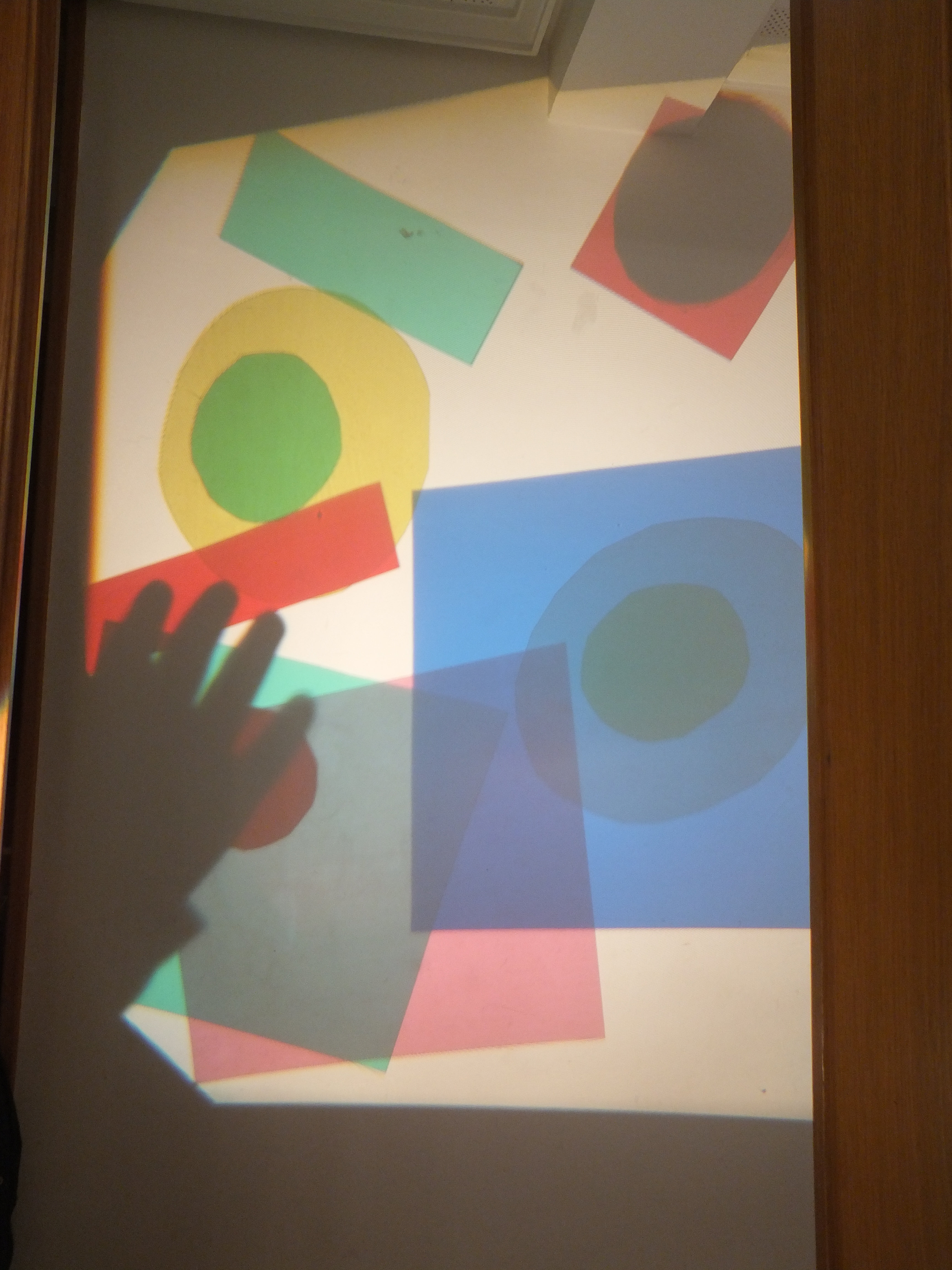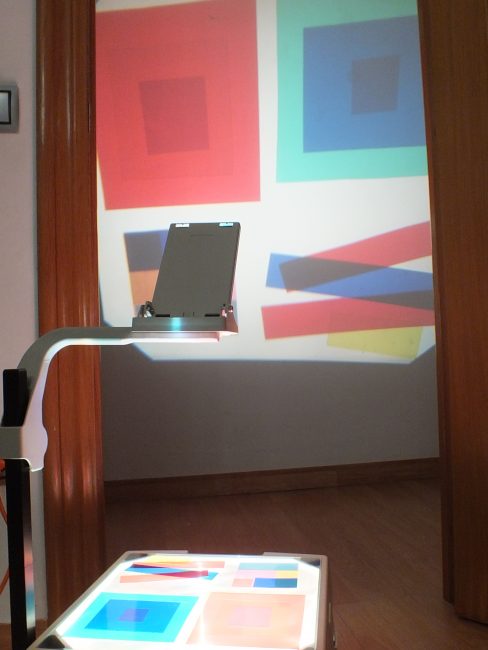 Un par de días después les preparé una provocación reggiana con papeles de acetato de colores con forma de cuadrados y círculos y el retroproyector. En un principio iba a recortar círculos, triángulos, cuadrados y rectángulos en folios de colores, pero pensé que así sería más atractivo para ellos a pesar de no hacerlo como Josef Albers.