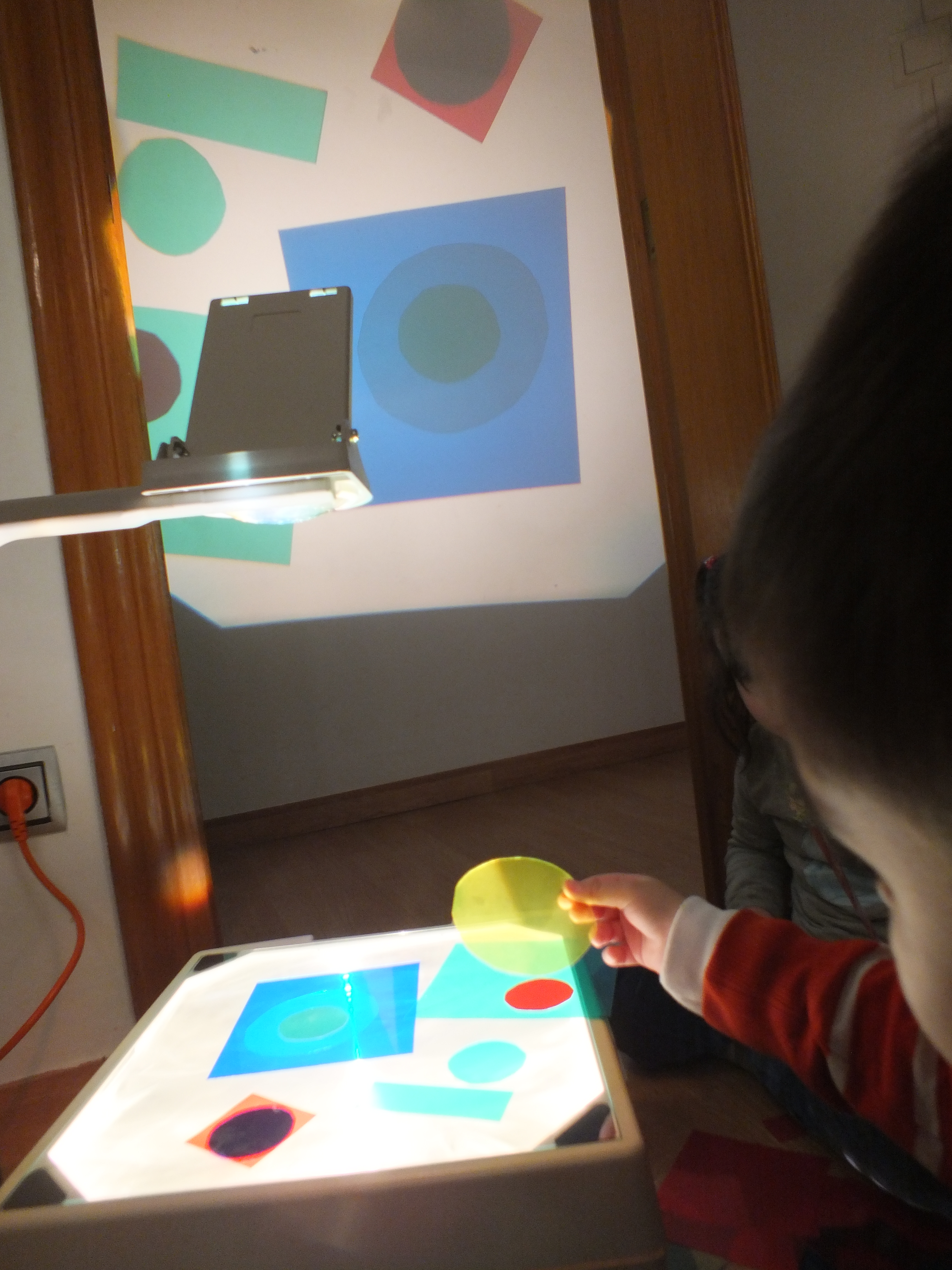 Nada más verla, se lanzaron sobre las formas y a encender el retroproyector y se pasaron un buen rato jugando con la luz y los colores.