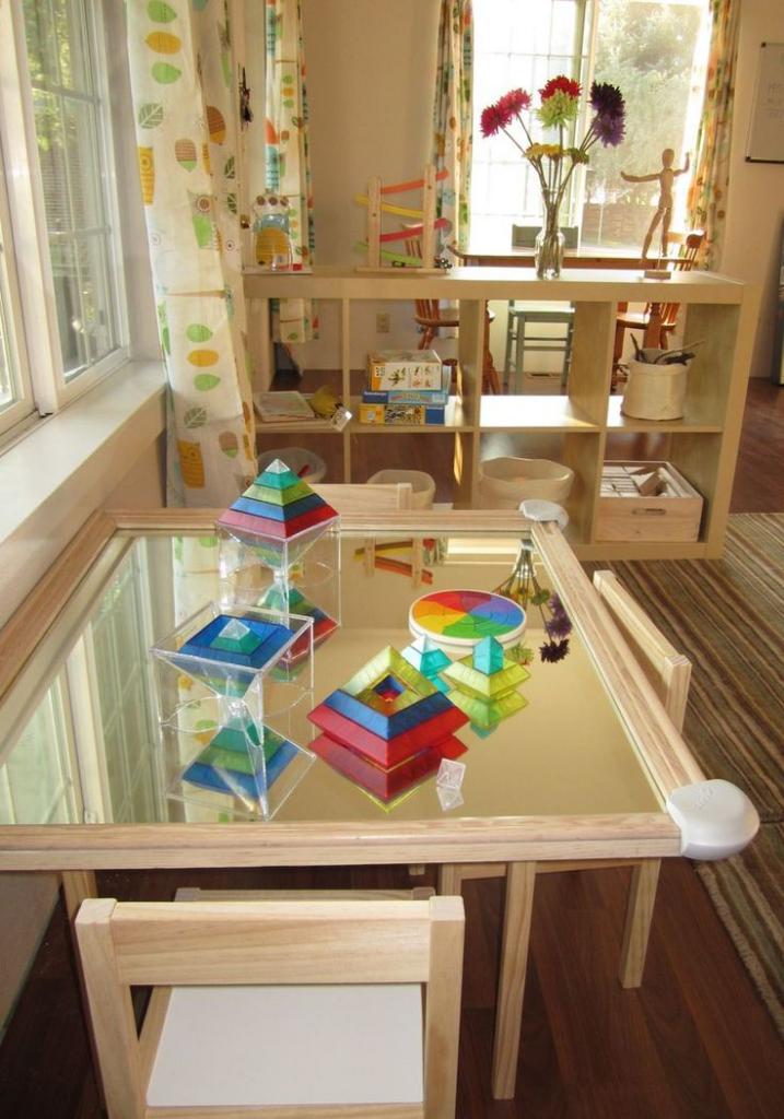 - Es imprescindible que haya un rincón de arte donde los niños puedan explotar su creatividad y exponer sus obras de arte. Podéis preparar una zona donde haya materiales de arte al alcance de los niños (una pizarra, rotuladores, ceras de colores blandas y duras, tizas, carboncillos, lápices de madera, pinceles, acuarelas, témperas, pigmentos, blocs de dibujo, papeles de diferentes tamaños y texturas…). Una idea para organizar estos materiales es colocarlos en un estante o carrito tipo los de Ikea, os dejo algunas ideas sacadas de Pinterest.